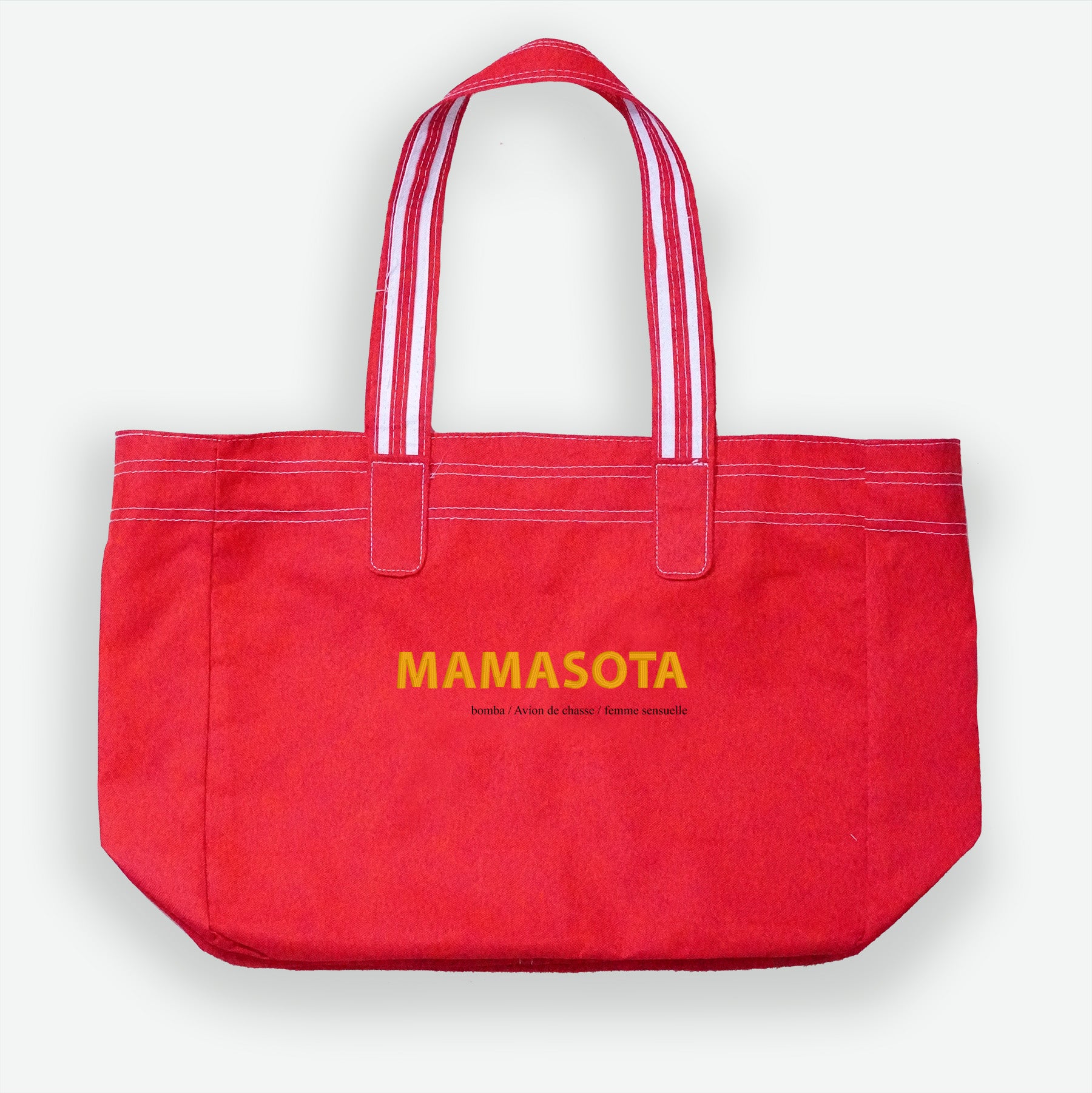 Sac (type tote ou shopper) avec broderie et impression avec le mot mamasota. Poche intérieure zippée imprimée. Surpiqûres contrastées dans le haut du sac. Anses de transport bicolore façon « sellier »