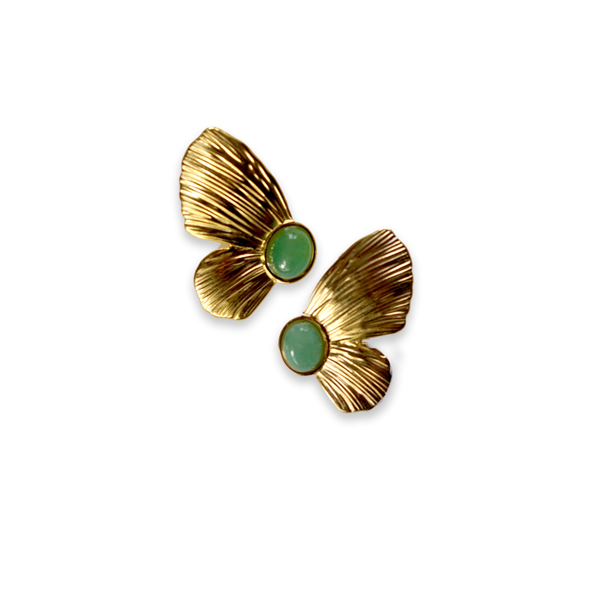 Des boucles d'oreilles en forme de demi-feuille avec une pierre verte, réalisées en acier dorée a l'or fin. Ces créations uniques évoquent la délicatesse d'une feuille et mettent en valeur une pierre d'un vert éclatant. L'acier confère à ces boucles d'oreilles une allure moderne et résistante.